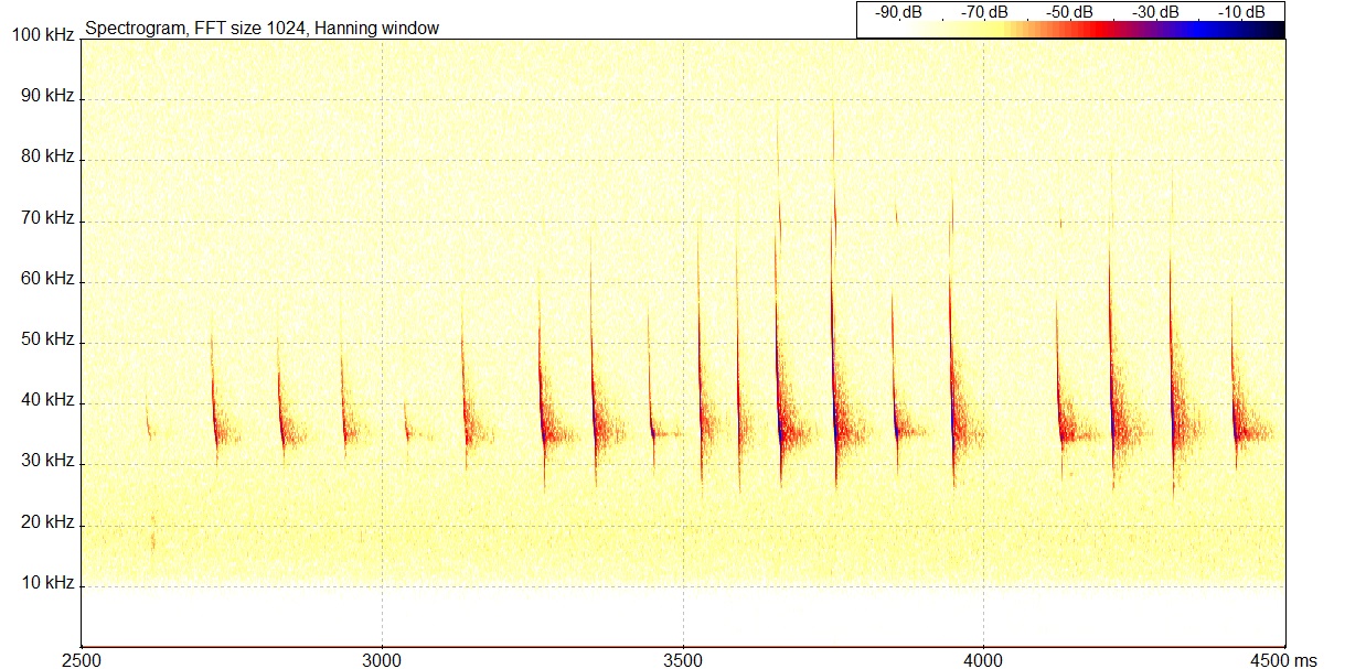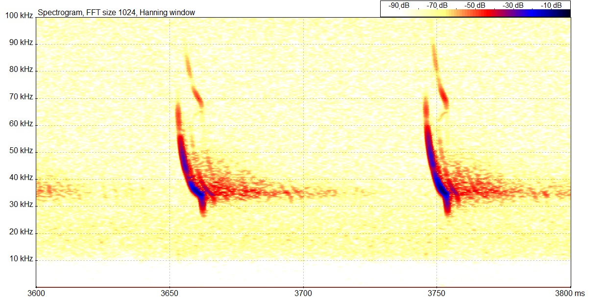 Än så har vi inga inspelningar från svensk mark, men våra vänner i Lettland (Gunārs Pētersons) och Tyskland (Petra Bach) har bjudit på dessa inspelningar. Dammfladdermusen flyger ofta inte så nära vattenytan att interferenser uppstår. Dessa inspelningar är dessutom från individer som flyger ganska ensamt. Sonogrammen kan annars likna vattenfladdermusens men med något lägre energimaximum.